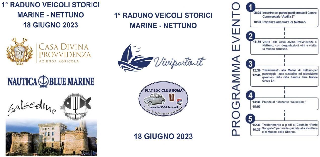 Il 18 giugno 2023, in occasione del 1° anniversario del lancio Ufficiale del sito Internet Viviporto.it, il giovane imprenditore romano Giorgio Magrì, ideatore e founder dell’innovativa StartUp, ha organizzato nel meraviglioso contesto del territorio di Nettuno, il “1° raduno di auto storiche delle Marine” in collaborazione con il FIAT 500 Club Roma.
